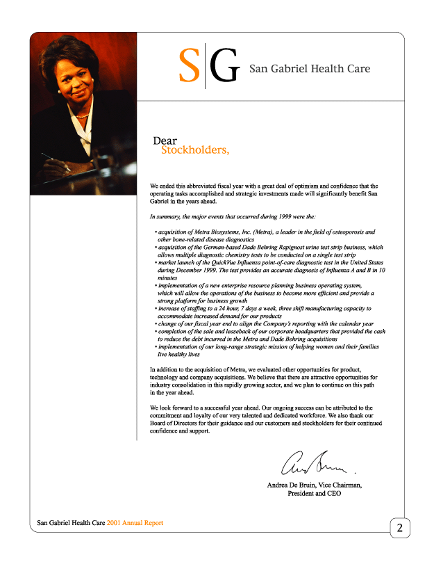 : After given only the name of the medical company, I designed an annual report cover and letter to the stockholders.