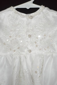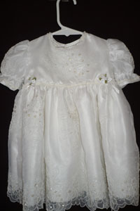 This sweet dress is a shorter version of some of my other gown. The dress is made of pure white satin and is adorned with organza lace with, pearls and sequin appliqu�s. Three, silk rose buds with ribbon streamers, and pearls are on the empire waist of dress and matching lace bonnet. Pearl cluster buttons complete this elegant dress. The dress has soft sateen lining for your baby�s comfort.