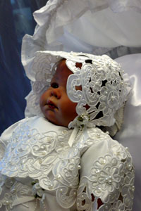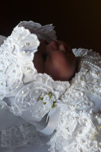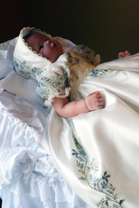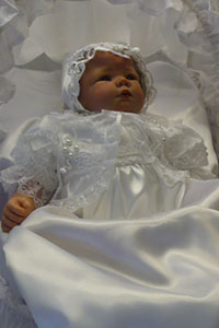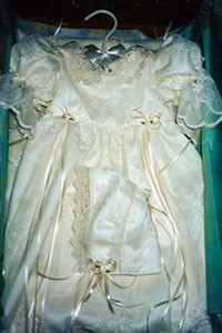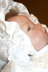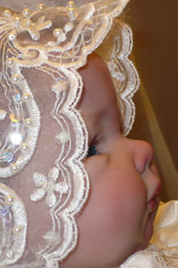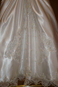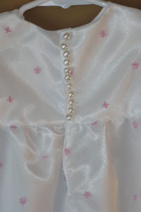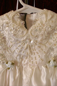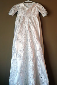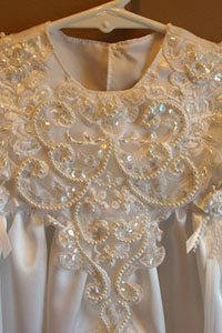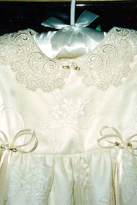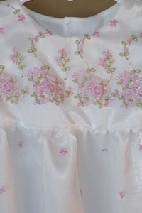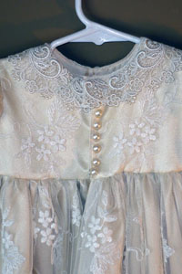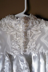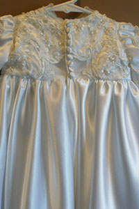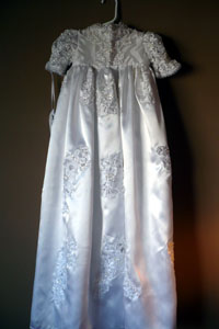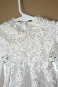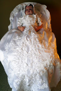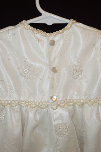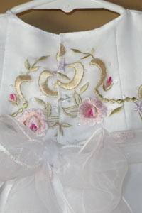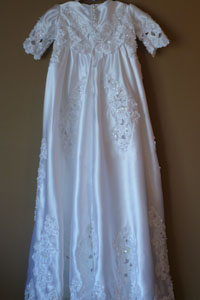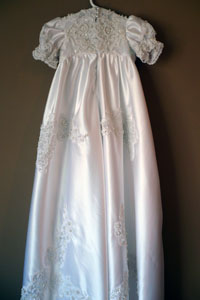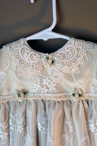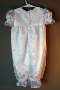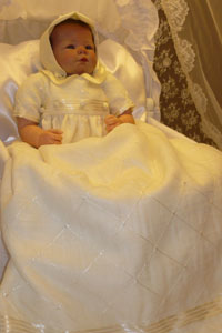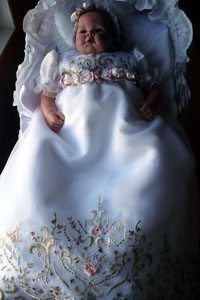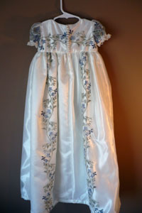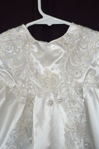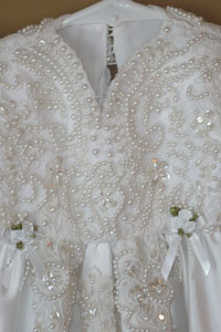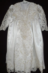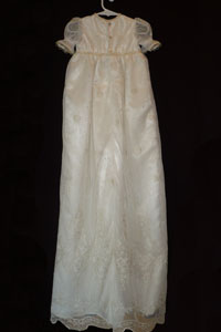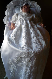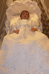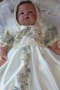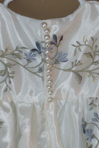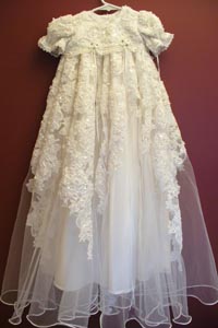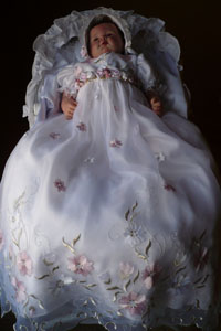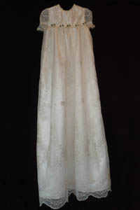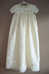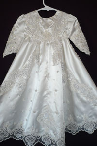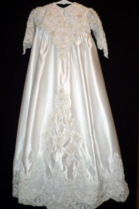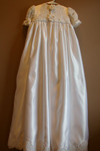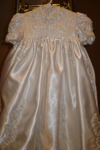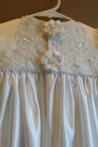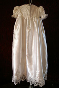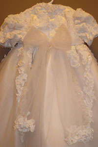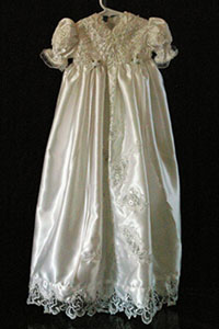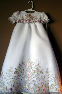 This gown was made especially for Madeleine, who will be Christened on Labor Day 2008 with her sister Nora. Gown is made entirely of silk. The gown�s bodice and capped sleeves are adorned with beautiful embroidery of pearls and sequins. The gown has a sheer embroidered overlay of lace, with satin flower appliqu�s, with light netting for fullness. The back of the gown has snap closure with Flower appliqu� buttons, and a satin ribbon tie. The gown has soft sateen lining for your baby�s comfort.