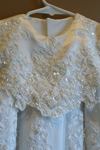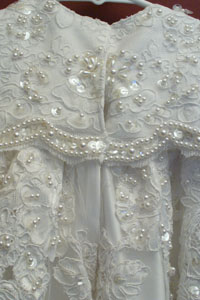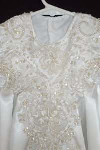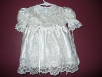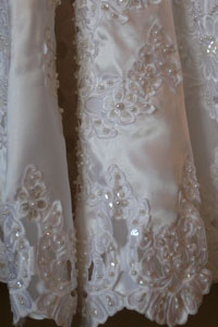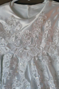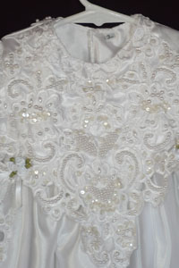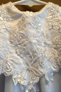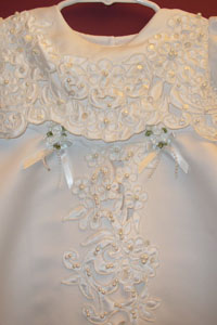 This sweet dress is a shorter version of some of my other gown. The dress is made of pure white satin and is adorned with embroidered lace, pearls and sequin appliqu�s.