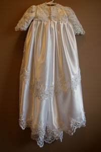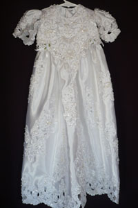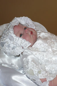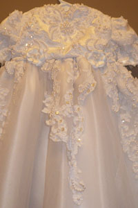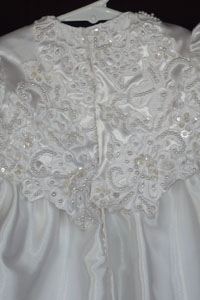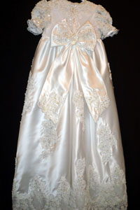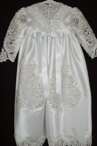 Bottom of gown is full lace of sequins and pearls. The back of the gown has a detachable satin bow. The gown has soft sateen lining for your baby�s comfort. Matching lined bonnet included.