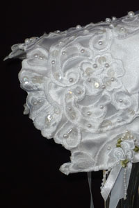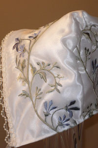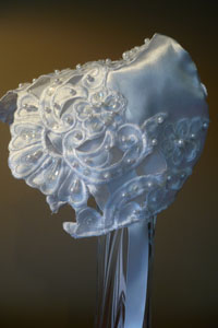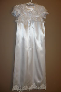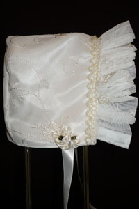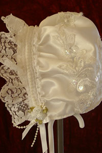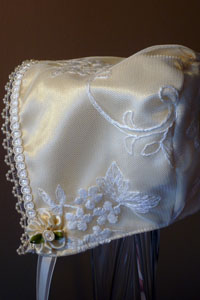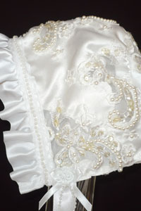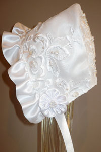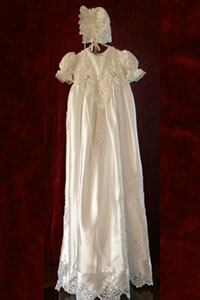 Gown is made of white silk satin with an organza embroidered overlay lace. Trimmed with satin flowers at the bodice that are removeable, Gown has a organza tie in the back, and neting for the beautiful full gown look. The gown has soft sateen lining for your baby�s comfort. Snap closure with pearl buttons in back. Matching lined bonnet included.