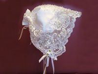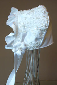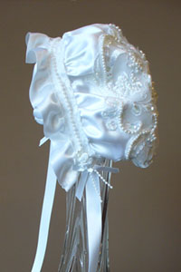 the, and matching bonnet. Pearl cluster buttons complete this elegant gown.