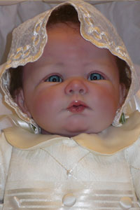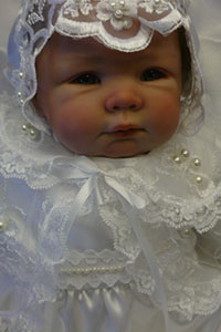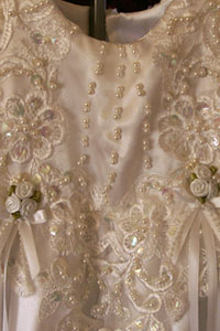 This precious special custom made gown is of stunning silk dupioni. It is beautifully embroidered with a V shaped bodice with long embroidered sleeves. The lace embroidery is generously adorned with pearls and sequins; there are three silk rose buds with ribbon streamers on the front of gown and bonnet. Gown has a lovely lace scalloped edge and beautifully embroidery appliqu�s with pearls on the center front of the gown. The back of the gown has snap closure with satin covered buttons and satin tie ribbon. The gown has soft sateen lining for your baby�s comfort. Matching lined bonnet included.