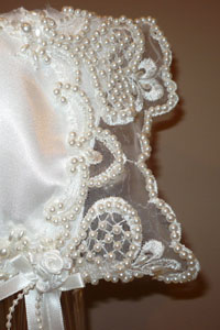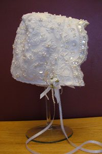 bonnet. Gown has a lovely lace beaded scalloped edge and beautifully