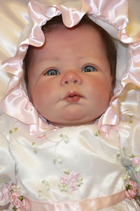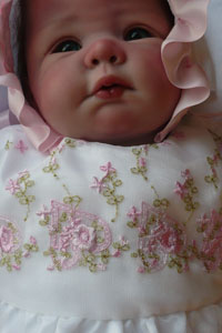 Three, silk rose buds with ribbon streamers, and pearls are on the empire waist of dress and matching lace bonnet. Pearl cluster buttons complete this elegant dress.