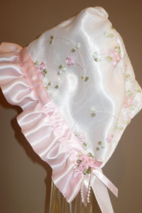 This sweet layette is ideal for just about any �take me home� occasion. Made of silk satin with an organza overlay embroidered lace of pink flowers. Trimmed with pink satin ribbon and three rose cluster flowers. Lace ruffle gathered bottom. The gown has soft sateen lining for your baby�s comfort. Matching lined bonnet included.