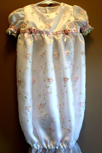 This sweet layette is ideal for just about any �take me home� occasion. Made of silk satin with an organza overlay embroidered lace of pink flowers. Lace ruffle embroidered gathered bottom. Pearl button accent the back of gown. The gown has soft sateen lining for your baby�s comfort. Matching lined bonnet with pink satin ribbon included.