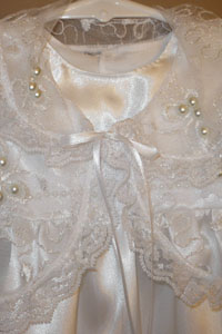 This precious gown is made of stunning silk dupioni. The gown�s has a lovely lace scalloped edge and beautifully lace embroidery appliqu�s down the back of gown. Lace and pearl trimming are on the sleeves and bodice of gown. A delicate embroidered lace netted overlay jacket accents this gown. Gown has snap closure. The gown has soft sateen lining for your baby�s comfort. Matching lined bonnet included.