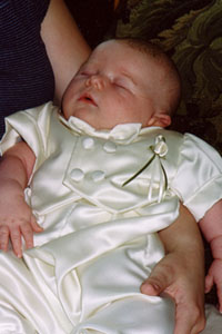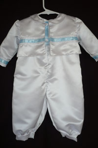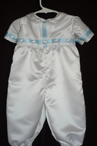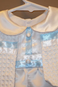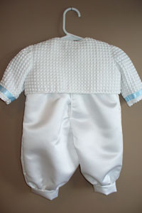 This cute little tuxedo romper suit is made of white silk dupioni., with white tux jacket, and pleated white shirt with matching blue vest and bow tie, an added touch of a silk flower on the lapel. Romper has a soft sateen lining for your baby�s comfort.