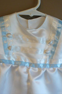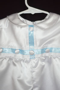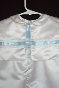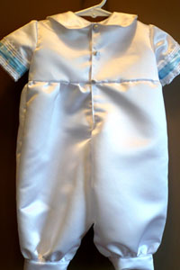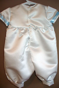Your little man will look absolutely princely in this white silk dupioni romper with silk satin trim in white and blue and satin covered button trim on front.