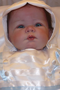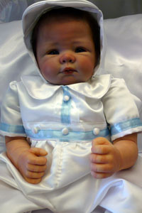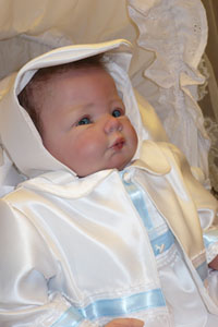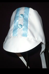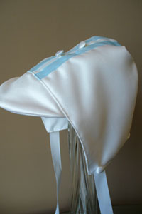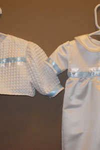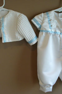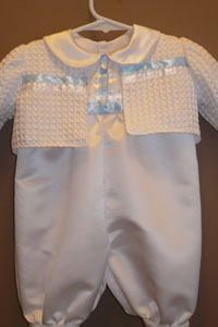 This outfit comes with a warm comfortable matching jacket trimmed with white and blue silk satin trim, with a soft sateen lining for your baby�s comfort. Matching lined bonnet included.