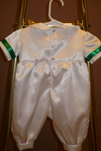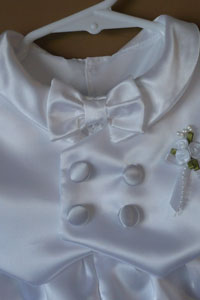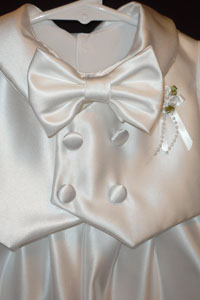 This cute little tuxedo romper suit is made of white silk dupioni. Attached pleated shirt and vest with bow tie, with an added touch of a silk flower on the lapel. Romper has a soft sateen lining for your baby�s comfort.