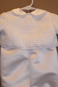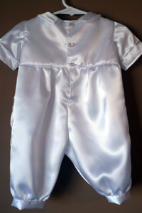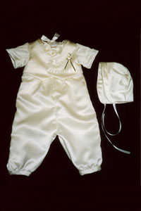 This cute tuxedo romper suit is made of white satin. Double vested with matching bow tie, an added touch of a silk flower on the lapel. Romper has a soft sateen lining for your baby�s comfort. Matching lined bonnet included.