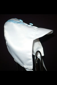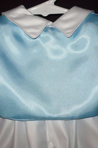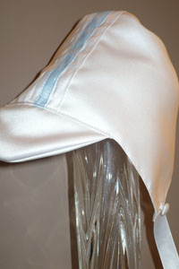 fabric trimmed with white and blue silk satin trim, with a soft sateen
