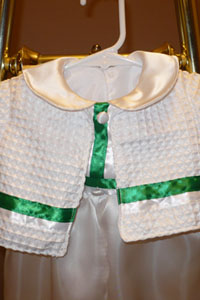 fabric trimmed with white and green silk satin trim, with a soft sateen